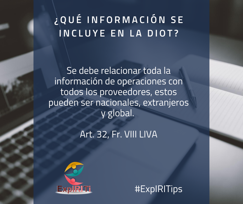 La DIOT es una obligación fiscal prevista más del IVA donde se da a conocer el estado de las operaciones para con terceros (proveedores) y es de suma importancia cumplir con este requisitos para evitar multas.